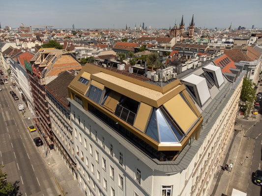 Die ersten Entwürfe des Bauvorhabens gehen auf das Jahr 2017 zurück. Sehr früh schon stand für den Architekten Klaus Heissbauer, der sich selbst gerne als „Gürtel-Fan“ bezeichnet, der Entschluss fest, an der städtebaulich prominenten Kreuzung der Neustiftgasse und des Lerchenfelder Gürtels, in Zukunft das wachsende Architekturbüro livingpool mit großzügigen und flexiblen Arbeitsplätzen anzusiedeln. So wurden im Zuge des Genehmigungsverfahrens eine gewerbliche Fläche mit rund 285 m2 sowie drei Wohnungen mit einladenden Freiflächen und insgesamt ca. 275 m2 Wohnfläche auf zwei Ebenen festgelegt. Im Zuge der Ausführung des Dachgeschosses wurde hofseitig eine Aufzugsanlage in einem Stahl-Glas-Schacht hergestellt sowie die Haustore und die Fassaden saniert. Im Ton wurden diese dem Gründerzeit- Ensemble und dem Nachbarhaus angepasst. Eine homogene Straßenfront entlang der Neustiftgasse ist nunmehr wiederhergestellt und bildet kontrastreich den Sockel zum architektonisch markanten Dachgeschossausbau. Im Herbst 2020 wurde das Projekt fertiggestellt und die Räumlichkeiten durch die EigentümerInnen der Wohnungen und der livingpool architektur zt gmbh bezogen. Die tatsächliche Aufwertung des früher kaum beachteten Eckhauses lässt sich anhand der Bilder - und weitaus besser noch direkt vor Ort entlang des Gürtelradwegs erfahren.