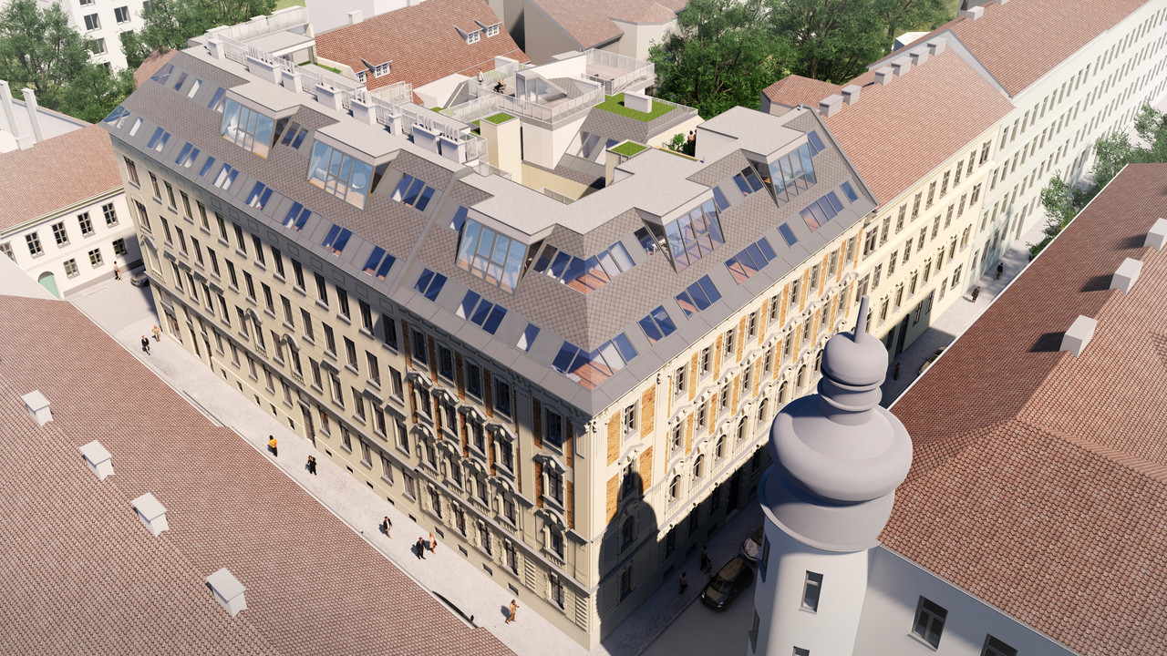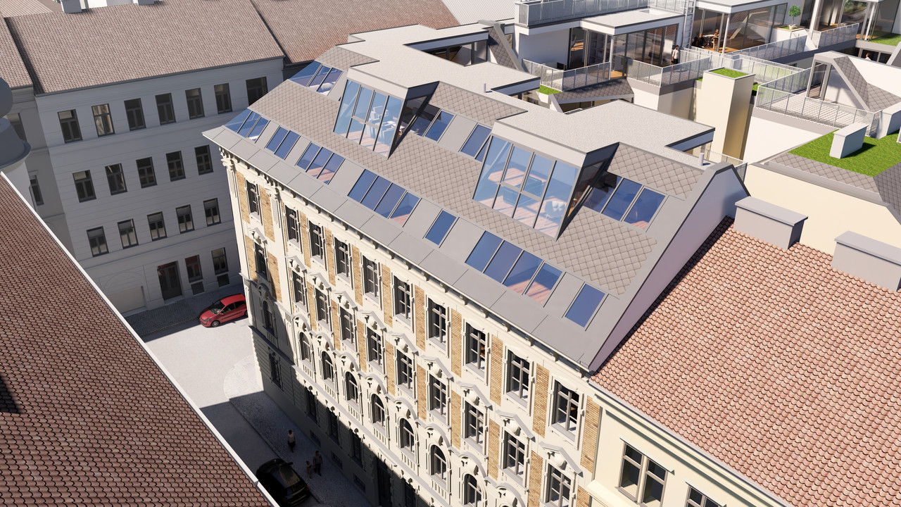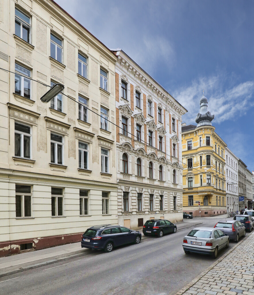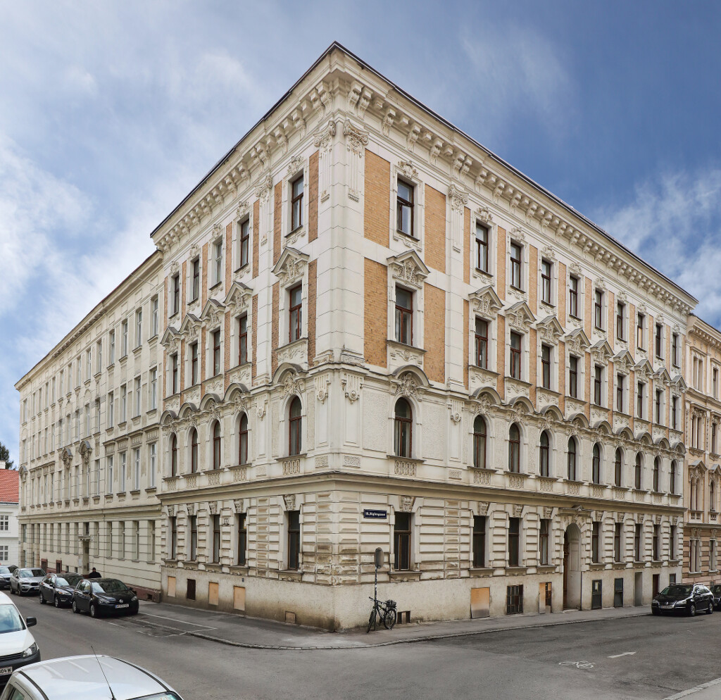Konzipiert ist das Gebäude als Gründerzeit-Eckhaus des Typus „Straßentrakter“. Das Stiegenhaus ist nicht, wie sonst üblich, Richtung Hof vorgelagert, sondern sitzt zentriert im Haus.