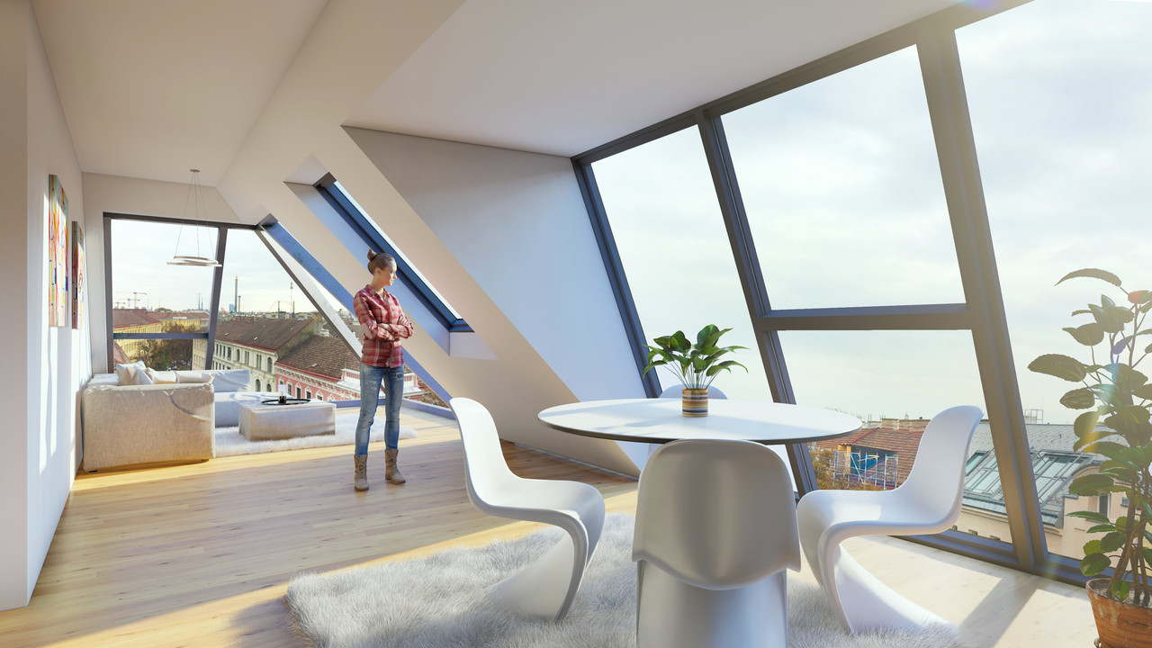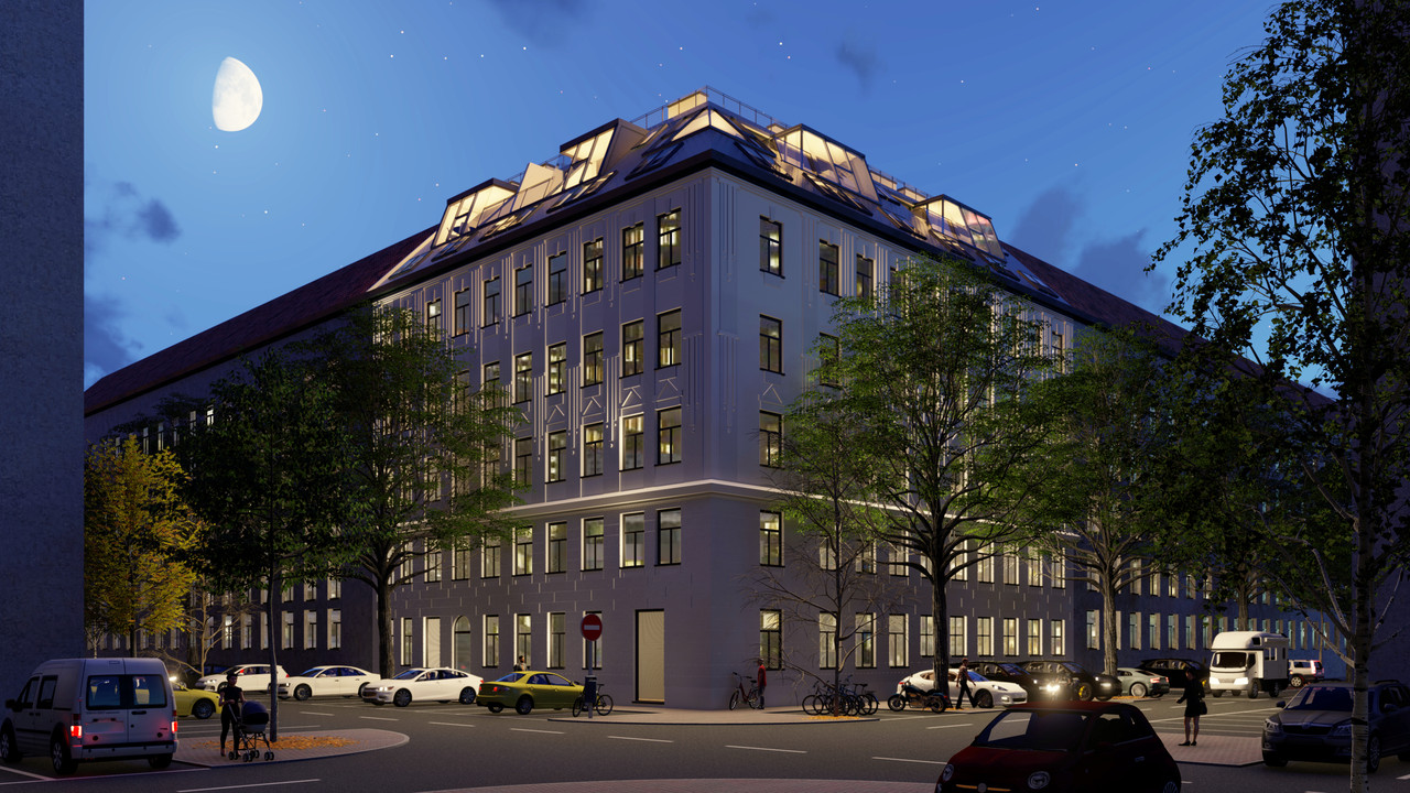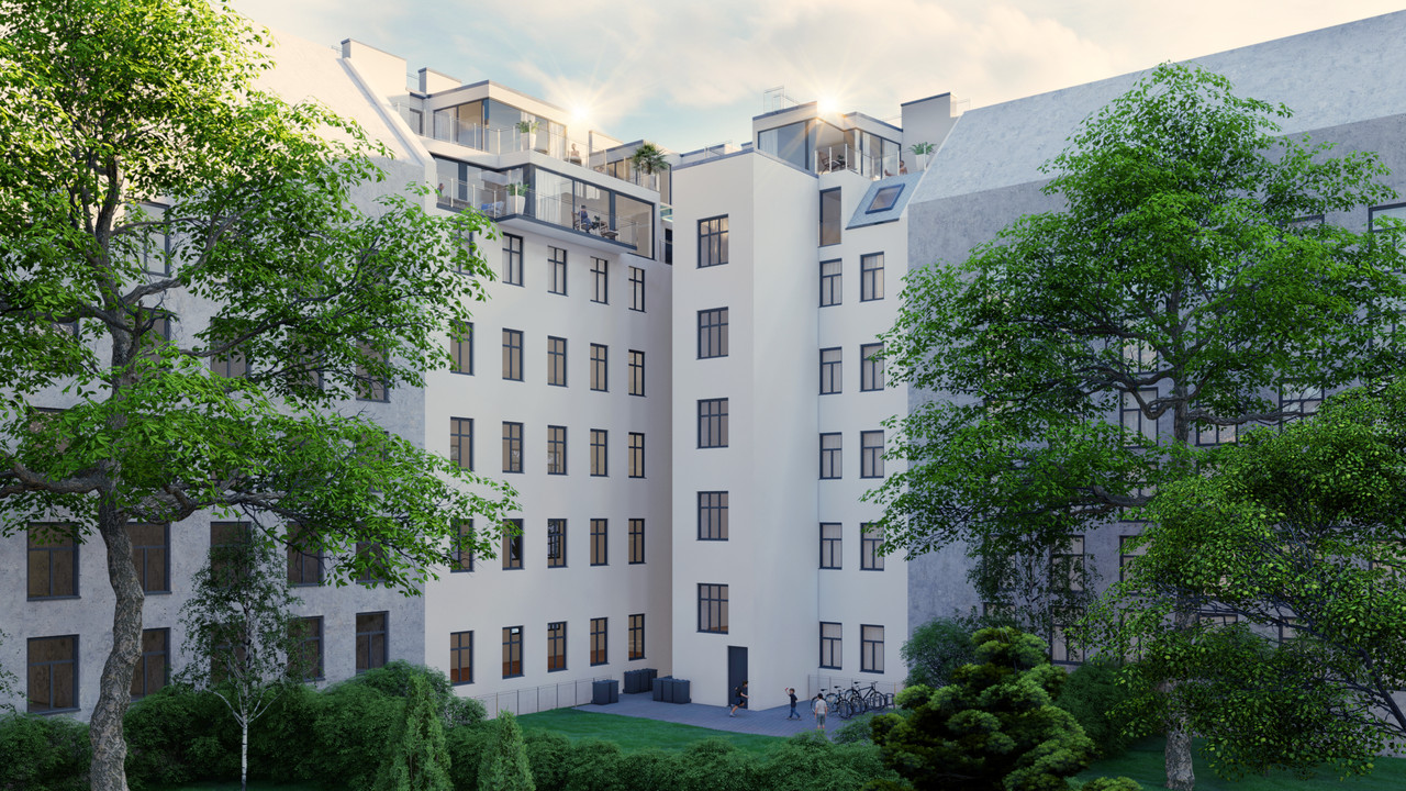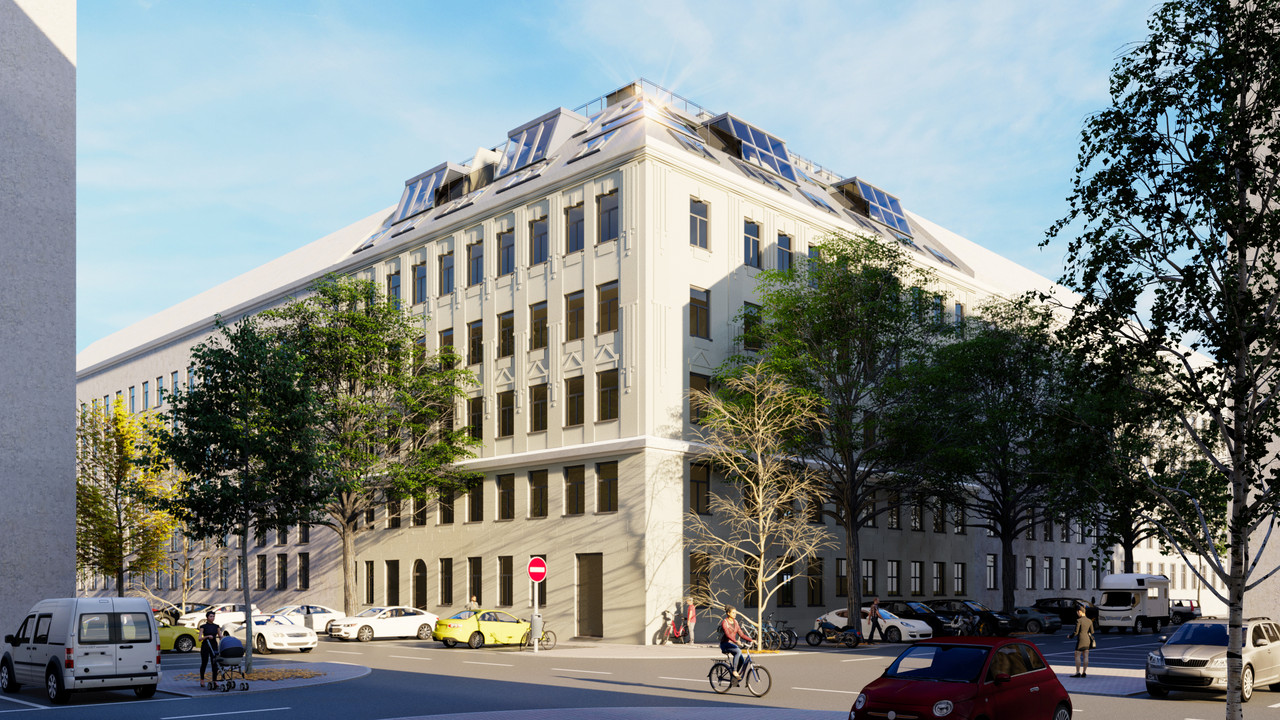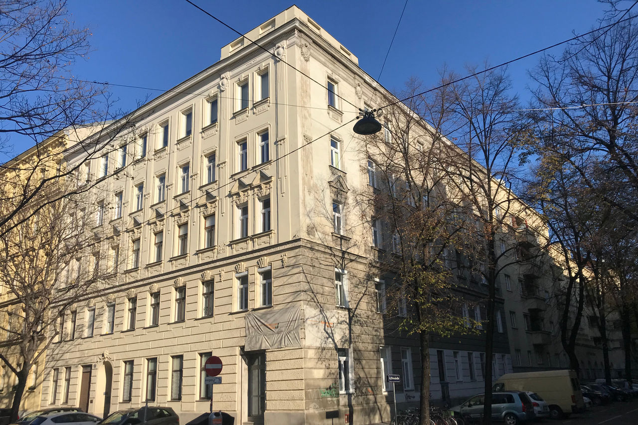 Typisch für die Gründerzeit ist das Haus als Eckhaus mit außenliegendem Stiegenhausturm konzipiert.
